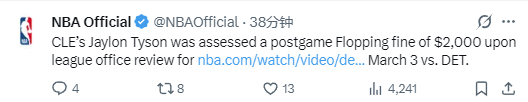 北京时间3月5日,NBA官方宣布,骑士队球员杰伦-泰森在对阵活塞队的比赛中出现假摔,被罚款2000美元。