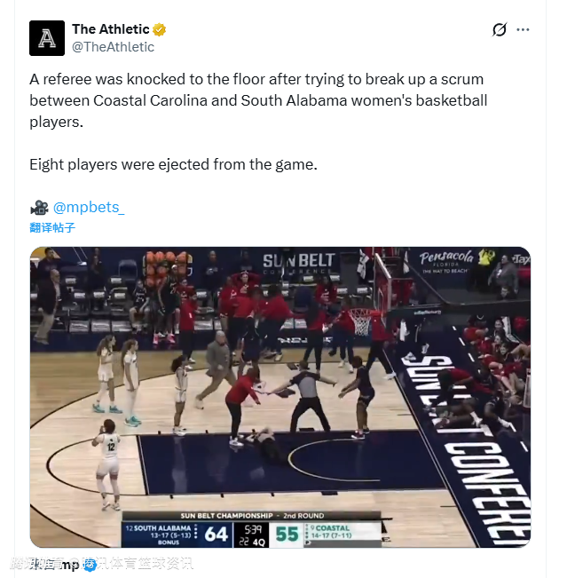 北京时间3月5日,在太阳带联盟女子篮球锦标赛中,南阿拉巴马大学与卡罗莱纳海岸大学的球员爆发冲突,此次事件导致8名球员被驱逐,一名女裁判在混乱中被撞倒在地,随后接受了医疗处理。