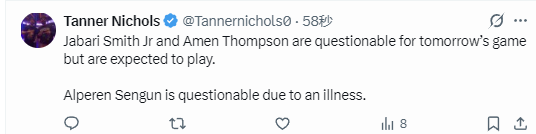 阿门-汤普森和小贾巴里-史密斯均遭遇了右脚踝扭伤,但根据火箭队记者Tanner Nichols报道,两人预计都会出战本场比赛。值得一提的是,此前火箭队主教练乌度卡曾表示,如果小贾巴里-史密斯复出,那么火箭队可能会重新采用之前的首发配置。火箭球员谢泼德则在今日的训练结束后接受采访,他表示不在意自己是否能继续打首发,只要能上场就会努力做到最好去影响比赛。
