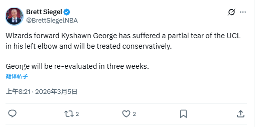 北京时间3月5日,据记者Brett Siegel报道,奇才前锋凯肖恩-乔治左肘尺侧副韧带部分撕裂,将采取保守治疗,在三周后接受复查。