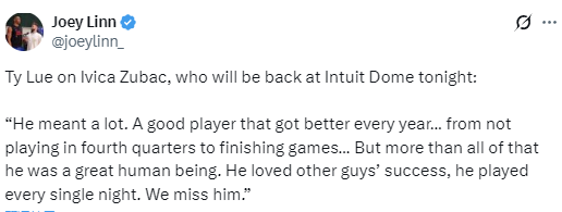 卢说道:“祖巴茨对我们意义重大。他是一名非常出色的球员,而且一年比一年进步,从最开始第四节无法登场,到能打完比赛收尾阶段…… 但比这些更重要的是,他为人非常好。他会为队友的成功感到开心,每晚都全力以赴。我们都很想念他。”在今年的交易截止日,快船队将祖巴茨交易至步行者队。