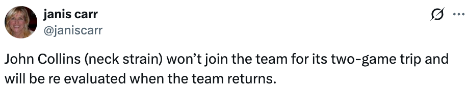 北京时间3月5日,据快船队记Law Murray报道,约翰-科林斯因颈部伤势,本周将无法出战,随后另外一名快船队记Janis Carr跟进报道,称科林斯将至少缺席快船接下来的3场比赛,在今天打完和步行者的比赛后,快船将奔赴客场,球队会从客场返回后,重新评估他的伤情。
