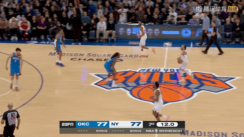 尼克斯在第三节完成18分反超,雷霆一度在这一节中领先12分,但尼克斯在不到一节时间里打出38比20的攻势,在第三节结束前1秒由布里奇斯命中压哨三分,将比分从77平改写为80比77,实现从落后到领先3分的巨大反转。