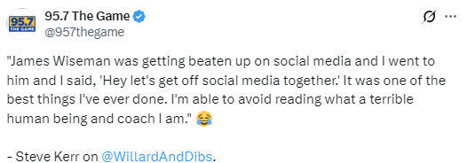 科尔还回忆了自己曾如何帮助怀斯曼应对舆论压力:“怀斯曼当时在社交媒体上被骂得很惨,我就去找他,跟他说,嘿,咱们一起把社交媒体卸了吧。这是我做过最棒的决定之一。我总算不用再去看那些说我人品多差、教练多烂的评论了。”