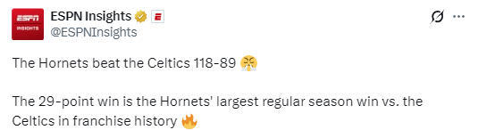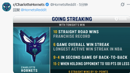 值得一提的是,这场比赛还是黄蜂队客场所取得的10连胜,创造了他们的队史纪录。除此之外,黄蜂队还创造了多项值得关注的数据,他们此役取胜后战绩已经达到了32胜31负,胜率超过50%。目前黄蜂队的6连胜,也是联盟中最长的连胜,在这6连胜期间,黄蜂队每场比赛都至少能净胜对手16分。