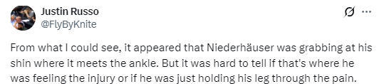 快船队随后立即用大洛佩兹换下尼德豪塞尔,之后他也被搀扶回更衣室,接受进一步的检查。快船队记者Justin Russo写道:“据我观察,尼德豪塞尔当时一直捂着小腿靠近脚踝的部位。但很难判断他的伤势具体就在那里,还是只是因为疼痛而扶住腿部。”