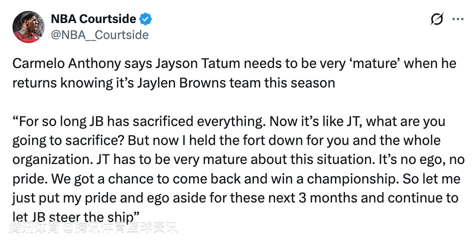 北京时间3月6日,近期,安东尼在节目中表示,塔图姆回归后必须保持足够成熟,要认清本赛季凯尔特人是属于杰伦-布朗的。
