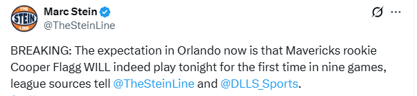 The Stein Line记者Marc Stein随后证实,弗拉格将在今天复出,独行侠队记Mike Curtis也确认了这一消息。据Curtis透露,这位新秀前锋对阵魔术时将有出场时间限制;如果没有出现反复,对阵波士顿的比赛出场时间会有所增加。