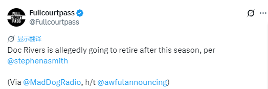 A-史密斯在SiriusXM电台节目中透露,老里弗斯将在本赛季结束后退休,“老里弗斯执教已近25年,他会选择离开。”