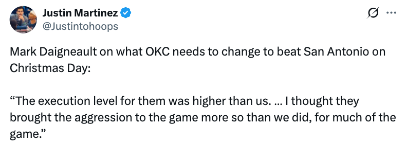 北京时间12月24日,NBA常规赛,雷霆以110-130不敌马刺,赛季至今他们输掉4场比赛,其中2场不敌马刺,赛后主帅戴格诺特接受了媒体的采访。