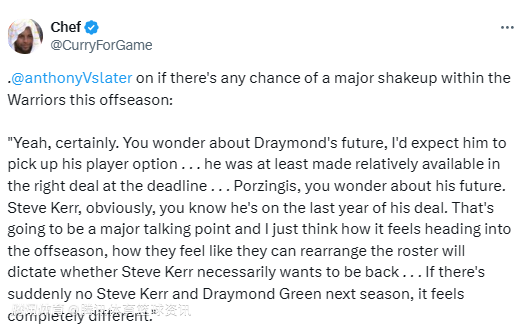 Slater表示:“当然有可能。你会好奇追梦的未来,我预计他会执行球员选项……但在交易截止日前,只要筹码合适,他至少是被球队摆上货架过的。波尔津吉斯的未来同样存疑。”