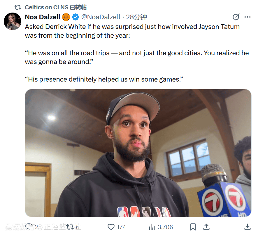 队友怀特则谈及塔图姆的投入与适配问题,他表示塔图姆全程陪伴球队,“他所有客场之旅都在——还不是那些好城市的客场。”同时怀特提到,球队打法虽有调整,但塔图姆参与了所有录像课,始终与球队同在,虽需适应缓冲期,但全队都以赢球为核心,愿意为夺冠全力以赴。