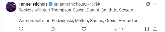 北京时间3月6日,NBA常规赛继续进行,火箭队对阵勇士队。赛前,双方公布了本场比赛的首发名单。