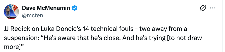谈及东契奇已累计14次技术犯规(再吃2次就将自动禁赛)时,雷迪克表示:“他清楚自己已经处在禁赛边缘,并且正在努力避免再领到技术犯规。”