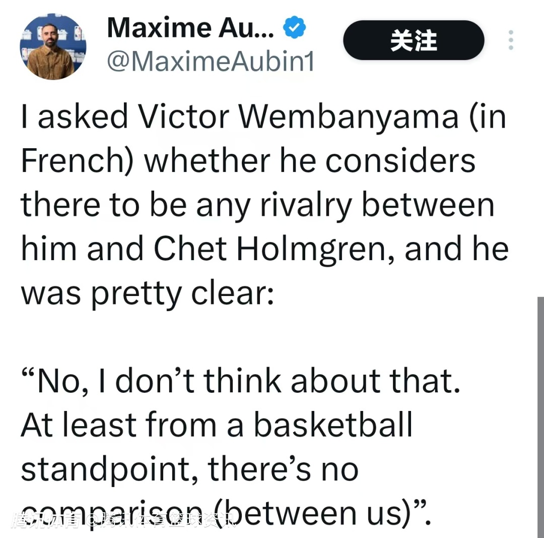 当被问及是否认为自己与霍姆格伦存在对位之争时,文班亚马态度明确:“不存在。我压根不考虑这个。至少从篮球层面来讲,我俩没有可比性。”本场比赛中,霍姆格伦出战27分钟,10中3得到7分3板1助攻1盖帽。
