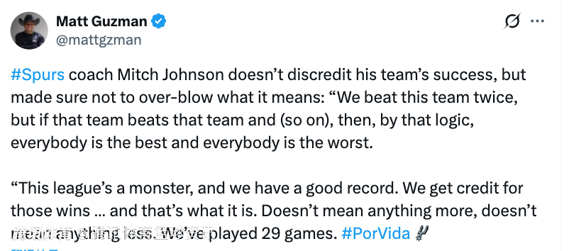 约翰逊没有否定球队的成功,但也强调不要过度放大其意义:“我们赢了这支球队两次,但如果按‘A赢B、B赢C所以A赢C’的逻辑,那联盟里所有人既是最好的也是最差的。”