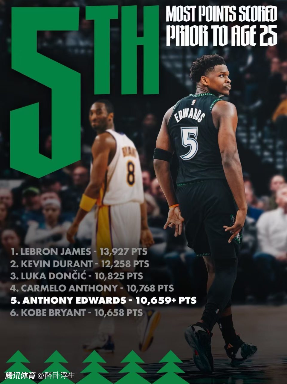 爱德华兹25岁前总得分超越科比升至历史第5位,仅次于詹姆斯、杜兰特、东契奇与安东尼。