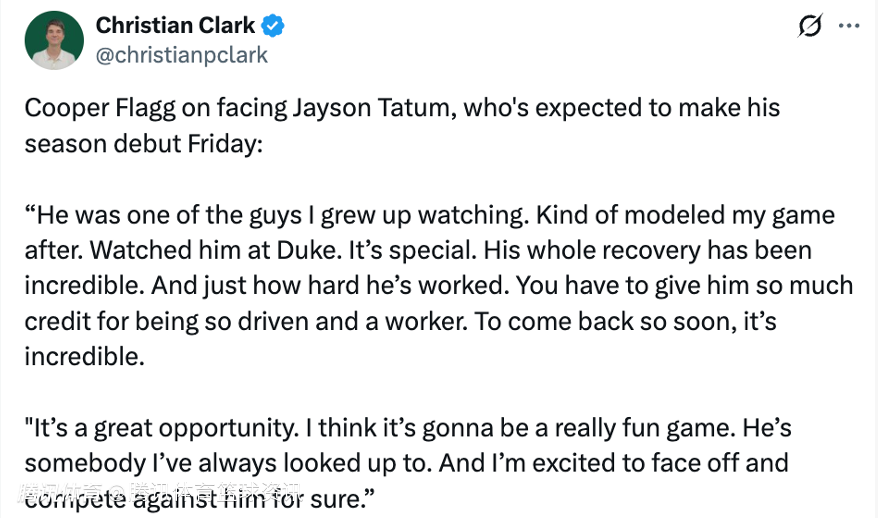 下场比赛,独行侠将对阵凯尔特人,届时对方核心塔图姆有望迎来复出,弗拉格表示:“他是我从小看着打球的球员之一,我的球风多少也受他影响。我看过他在杜克大学的比赛,能和他同场竞技很特别。他的康复过程太不可思议了,能这么快回归,真的太拼了。他的进取心和刻苦程度值得所有人称赞。这是很棒的机会,我觉得这场比赛会很有趣。他一直是我敬仰的球员,能和他对位竞争,我真的很期待。”
