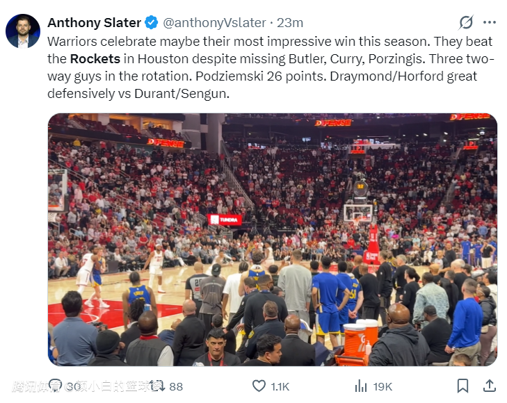 勇士记者安东尼-斯莱德:勇士或许迎来本赛季最瞩目的胜利。失去了巴特勒、库里、波尔津吉斯他们客场还是能击败西部第三的勇士。替补阵容的三位多面手发挥了重要作用,追梦/霍福德防守端发挥出色成功限制了申京与杜兰特。