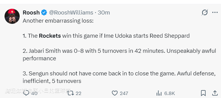 申京的糟糕表现掩盖了伊森、小贾更为糟糕的表现,小贾8中0+5个失误;