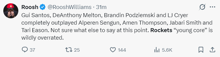 休媒:桑托斯、梅尔顿、波杰姆斯基、克莱尔的表现完全超过了申京、阿门、小贾、伊森,此刻我都不知道说什么好,我们火箭的年轻核心们明显被高估了。