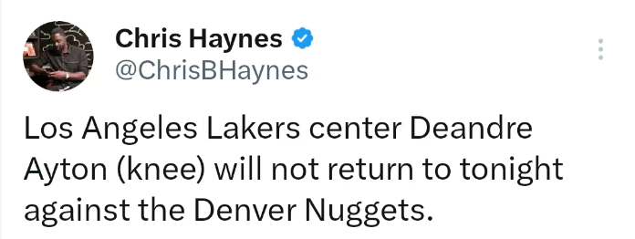 据湖人队记麦克梅纳明报道,湖人下半场变阵,由海斯出任首发中锋,球队目前仍未就艾顿的情况发布任何说明,艾顿在第一节首次轮换被换下后,就再也没有出现在替补席上。据最新消息,艾顿膝盖受伤退出比赛,本场比赛不会回归。
