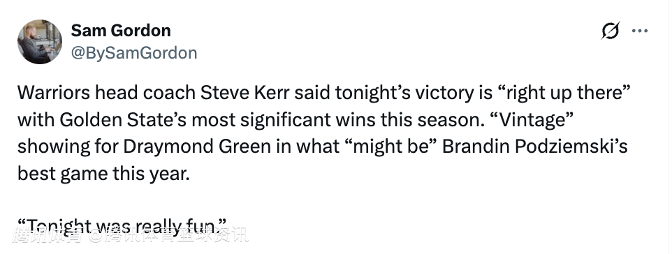 科尔表示,今晚的胜利足以跻身勇士本赛季最重要的胜利之列,追梦打出了经典表现:“今晚真的太开心了,不管是面对小卡还是杜兰特,我觉得追梦都非常享受这种机会,因为他依然是世界级的防守者,这是经典版追梦——防守、领导力、场上冲击力、传球,样样在线。”
