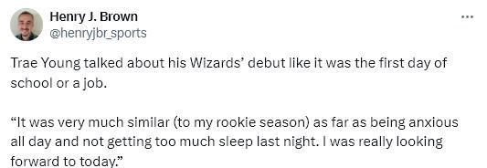 北京时间3月6日,NBA常规赛继续进行,奇才队112-122不敌爵士队。奇才队球员特雷-杨此役9投4中得到12分2篮板6助攻2抢断。赛后,他接受媒体采访,谈到了自己完成奇才生涯首秀的感受。