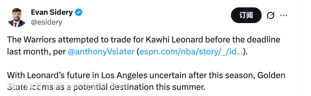 北京时间3月6日,据勇士队记Anthony Slater报道,在前不久的交易截止日前,勇士曾经询问过小贾伦-杰克逊、字母哥,并且在快船看似愿意交易时也询价过小卡,但这些交易最终都未达成。不过由于小卡本赛季结束后在快船的未来尚不明确,勇士也会成为他今夏的潜在下家。
