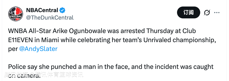 北京时间3月7日,据美记Andy Slater报道,WNBA全明星球员阿里克-奥贡鲍尔当地时间周四在迈阿密E11EVEN夜店,庆祝自己球队夺得Unrivaled联赛冠军时被捕。