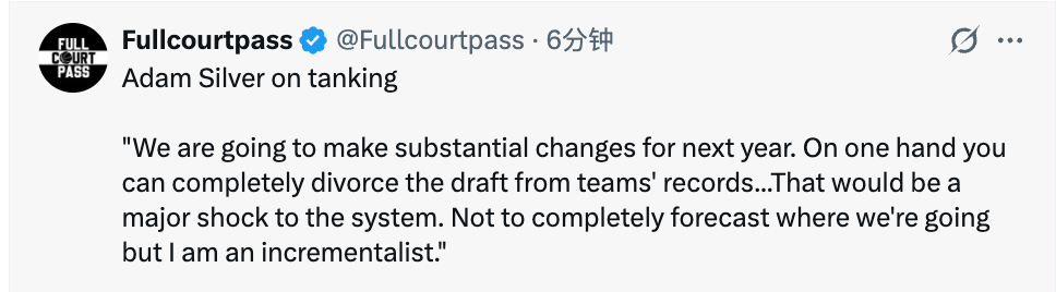 萧华指出,目前的矛盾在于:联盟存在合理的重建需求,即便有些球队在赛季末让核心轮休、给年轻球员机会,这也并非他所担忧的“摆烂”。他更在意的是今年出现的摆烂伦理层面的变化——他将其称为一场“完美风暴”:今年6月将迎来一届潜力十足的选秀,而未来几年的选秀预期则相对平淡,这诱使球队刻意摆烂。