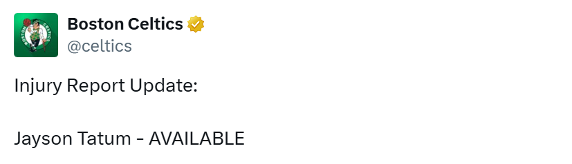 比利拉德年轻近8岁、比哈利伯顿早受伤约6周的塔图姆,并未像前两人那样在赛季初就被宣布赛季报销。凯尔特人从未发布过类似声明,而塔图姆在康复初期就明确表示,希望提前于常规康复时间表,在2025/26赛季结束前复出。