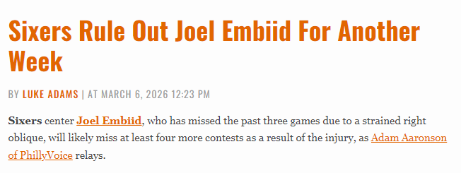 北京时间3月7日,据队记 Adam Aaronson报道,76人中锋恩比德因右侧斜肌拉伤已缺席过去三场比赛,此次伤势大概率还将让他至少再缺阵四场比赛。