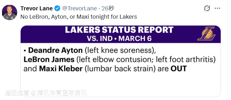 北京时间3月7日,NBA常规赛继续进行,湖人对阵步行者。赛前,湖人方面公布球队本场比赛伤情报告,詹姆斯、艾顿、克勒贝尔均将缺席。
