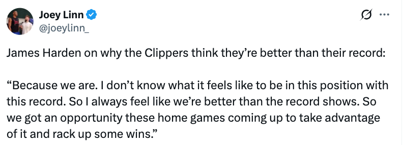 谈及快船队为何认为自身实力强于当前战绩,哈登表示:“因为我们本来就更强。我从没经历过这种战绩对应的处境,所以我始终觉得球队的自身真实实力比战绩体现的要更好。接下来我们有主场比赛的机会,得抓住机会多赢几场球。”
