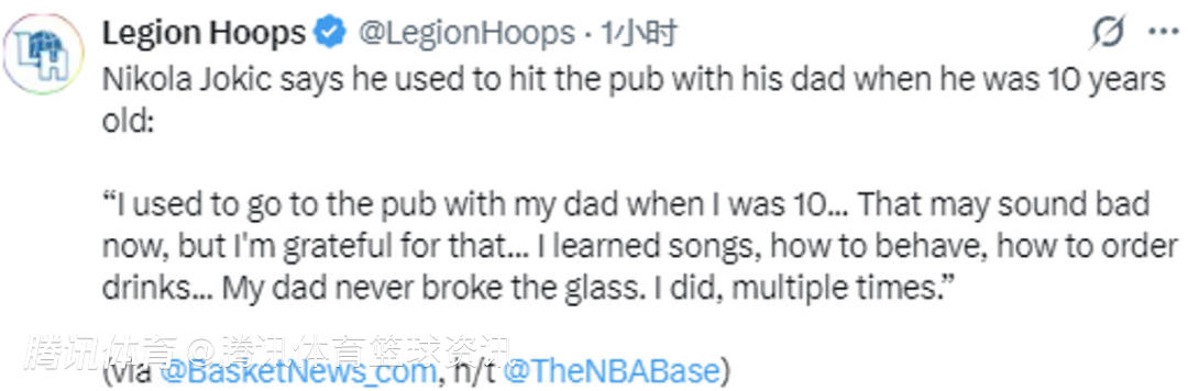 北京时间3月7日,掘金队中锋约基奇透露,自己10岁时就跟自己的父亲一起去酒吧。