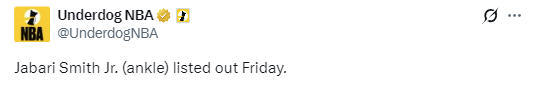 除了小贾巴里-史密斯之外,火箭队还有亚当斯、范弗利特和泰特三名球员因伤缺阵,而同样脚踝有伤的阿门-汤普森此役可以出战。