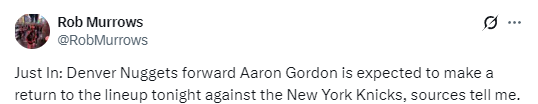 北京时间3月7日,NBA常规赛继续进行,掘金队对阵尼克斯队。本场比赛,掘金队球员阿隆-戈登将迎来复出,此前他已经因为右腿筋拉伤连续缺席了17场比赛。