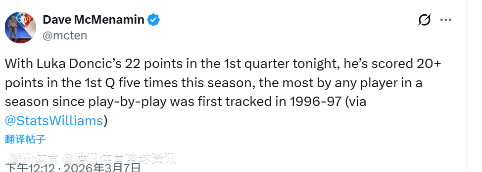 根据数据统计显示,这是东契奇本赛季第5次首节砍下20+,排名联盟第一。布伦森和贾马尔-穆雷本赛季各自有2次首节20+的表现,其余9名球员曾1次做到这点。此外,东契奇1996-97赛季开始逐场技术统计以来,联盟单赛季首节20+次数最多的球员。