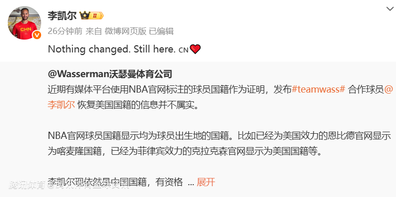 李凯尔本人随后转发此动态,并写道:“Nothing changed. Still here,CN❤️(什么都没有改变,我还在这里,中国爱心)
