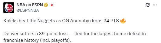北京时间3月7日,NBA常规赛继续进行,掘金队主场103-142惨败给了尼克斯队。根据数据统计显示,单场输掉39分,追平了掘金队历史(含季后赛)主场最大输球分差纪录,同时也创造了掘金队本赛季单场最高输球分差,此前他们最多单场输给对手15分。
