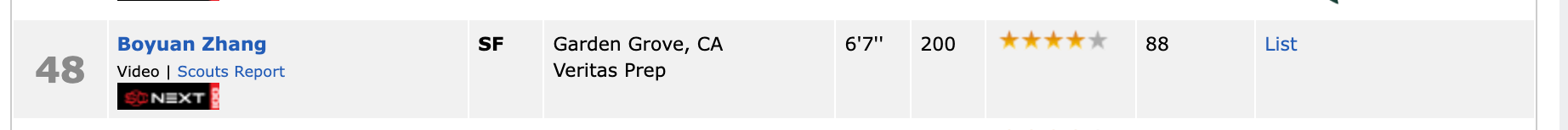 北京时间3月7日,ESPN更新2026届全美高中生排名,其中,现效力于维瑞塔斯学院的中国球员张博源排名全美第48位,评级为四星高中生。而在榜单上的另一名中国球员郇斯楠位列第83位,他将在新赛季加盟NCAA普渡大学。