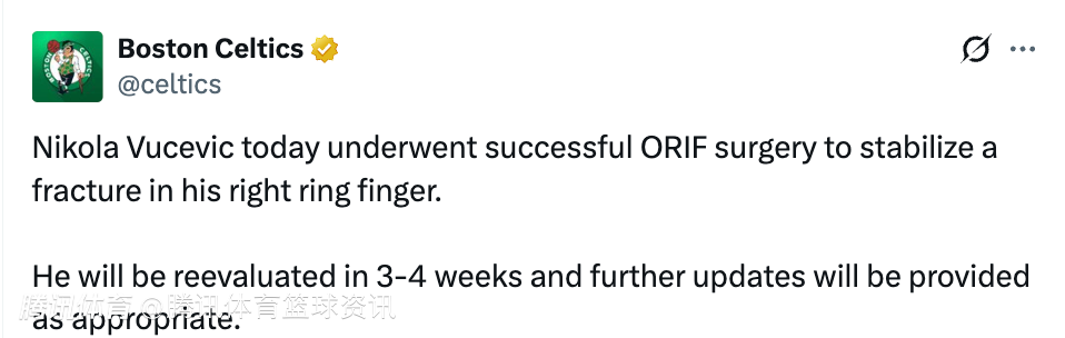 北京时间3月7日,凯尔特人官方宣布,武切维奇今日成功接受了切开复位内固定(ORIF)手术,以稳定其右手无名指的骨折。他将在3-4周后接受复查,后续将根据情况发布进一步更新。