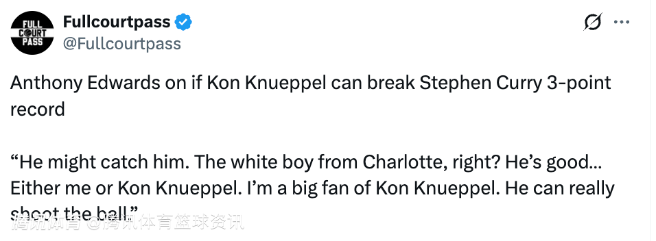 被问及克努佩尔能否打破库里的历史总三分命中数纪录,华子表示:“他有可能追上库里的。就是那个来自夏洛特的白人小伙,对吧?他打得很棒,要么是我,要么是克努佩尔。我超看好克努佩尔,他投篮是真的准。”