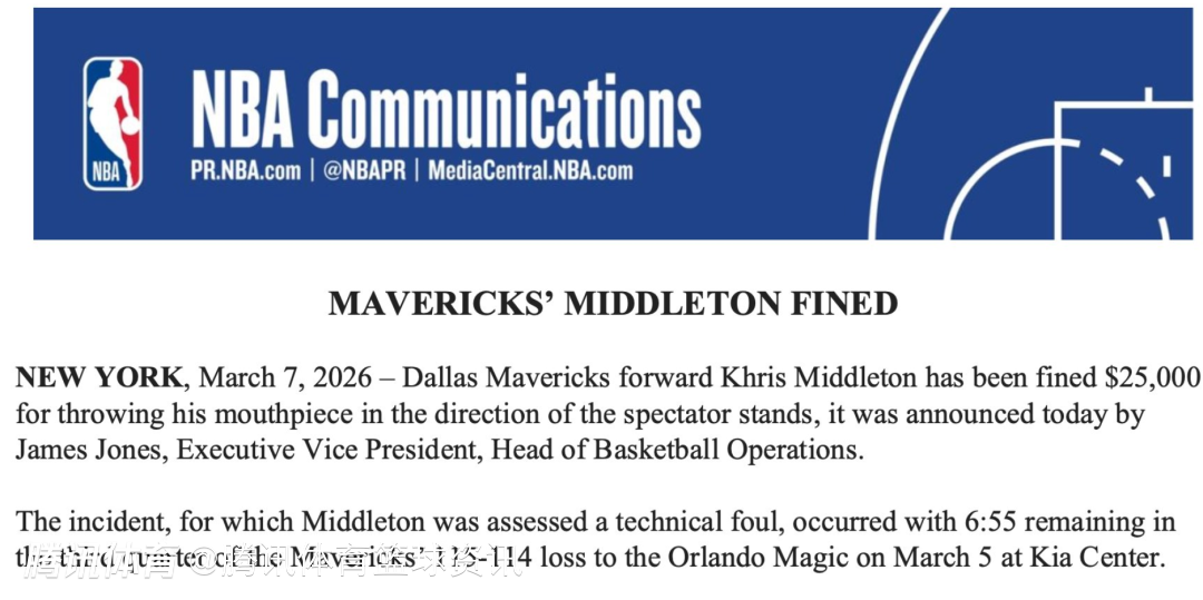 北京时间3月8日,NBA官方发布处罚公告,对独行侠球员米德尔顿处以25000美元的罚款。