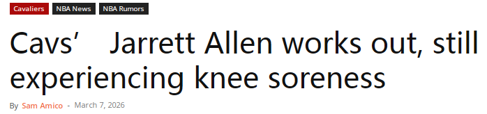 另据报道,骑士队的阵容正在逐步恢复健康,但在对阵凯尔特人之前,艾伦依旧是最大的疑问点。据悉,因右膝酸痛未愈,艾伦没有参加球队合练,只进行了轻度的个人训练。这次伤势源于对阵活塞的比赛中一次膝盖对撞,骑士最终以113-109取胜。主教练阿特金森早些时候表示,这只是一次简单的碰撞。“他当时和对手膝盖顶到了一起。”