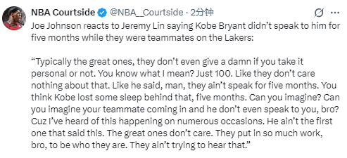 北京时间3月8日,前NBA球员乔-约翰逊在直播节目中谈到林书豪曾说自己在湖人当队友时,科比整整五个月没跟他说过话,并给出如下回应。