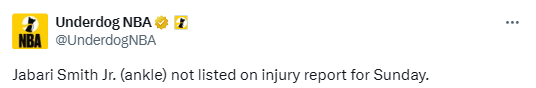 小贾巴里-史密斯回归可能让谢泼德重回替补席。此前在对阵开拓者的比赛中,谢泼德首发出战35分钟,得到17分3篮板6助攻1抢断3盖帽。