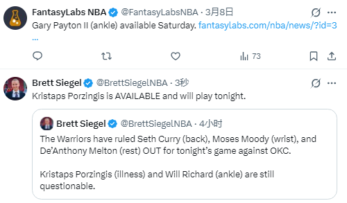 此前,勇士官方已确定塞斯-库里(背部伤势)、穆迪(手腕伤势)、梅尔顿(轮休)将缺席今晚对阵雷霆的比赛。但波尔津吉斯(生病)、理查德(脚踝伤势)出战状态仍为出战成疑。