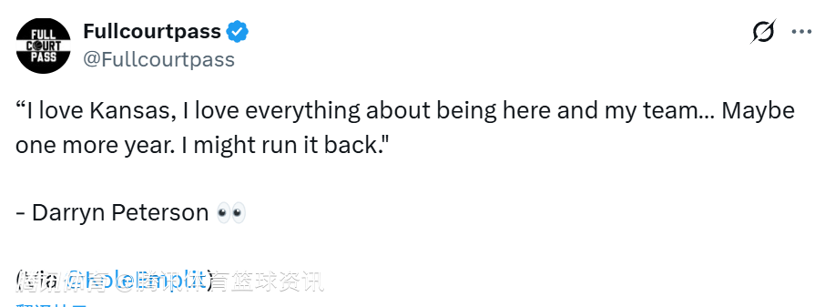 皮特森还谈到了堪萨斯大学队内流传的“达伦爱堪萨斯”的梗,他说道:“这就是个内部梗,只是想说明我真的爱堪萨斯,因为总有人在说我不爱堪萨斯。所以我爱堪萨斯,我爱这里的一切,爱我的球队,或许我会再打一年,我可能会选择回来。”